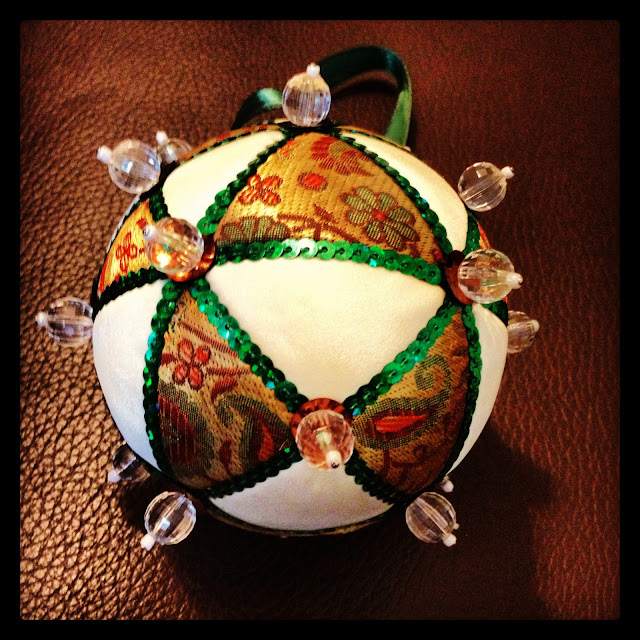 Bola de 9 cm. de diámetro realizada con dos tipos de tela formando un precioso diseño, y adornada con lentejuelas, abalorios y rematada con cinta de raso verde.